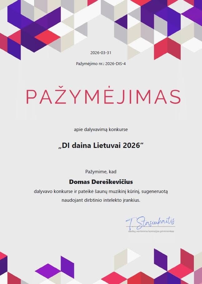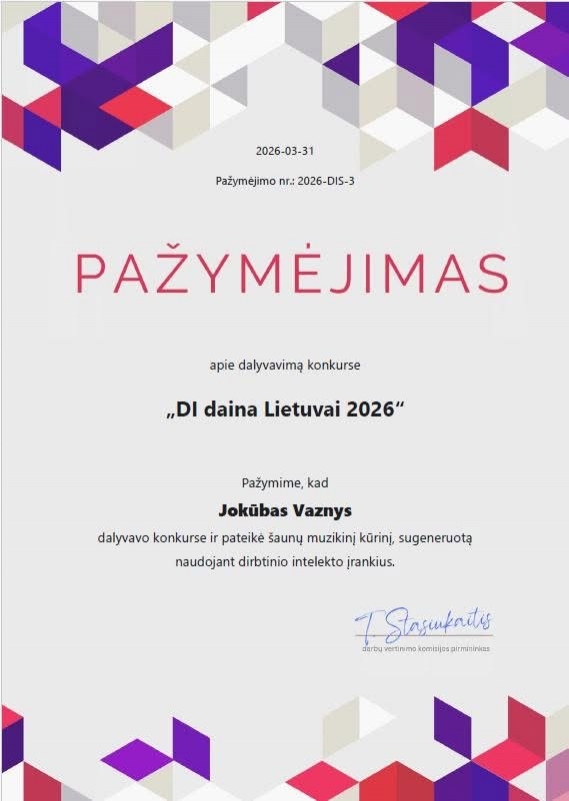 Mūsų mokyklos mokiniai Domas ir Jokūbas dalyvavo respublikiniame konkurse „DI daina Lietuvai 2026“, kuriame kūrė muziką pasitelkdami dirbtinio intelekto įrankius.