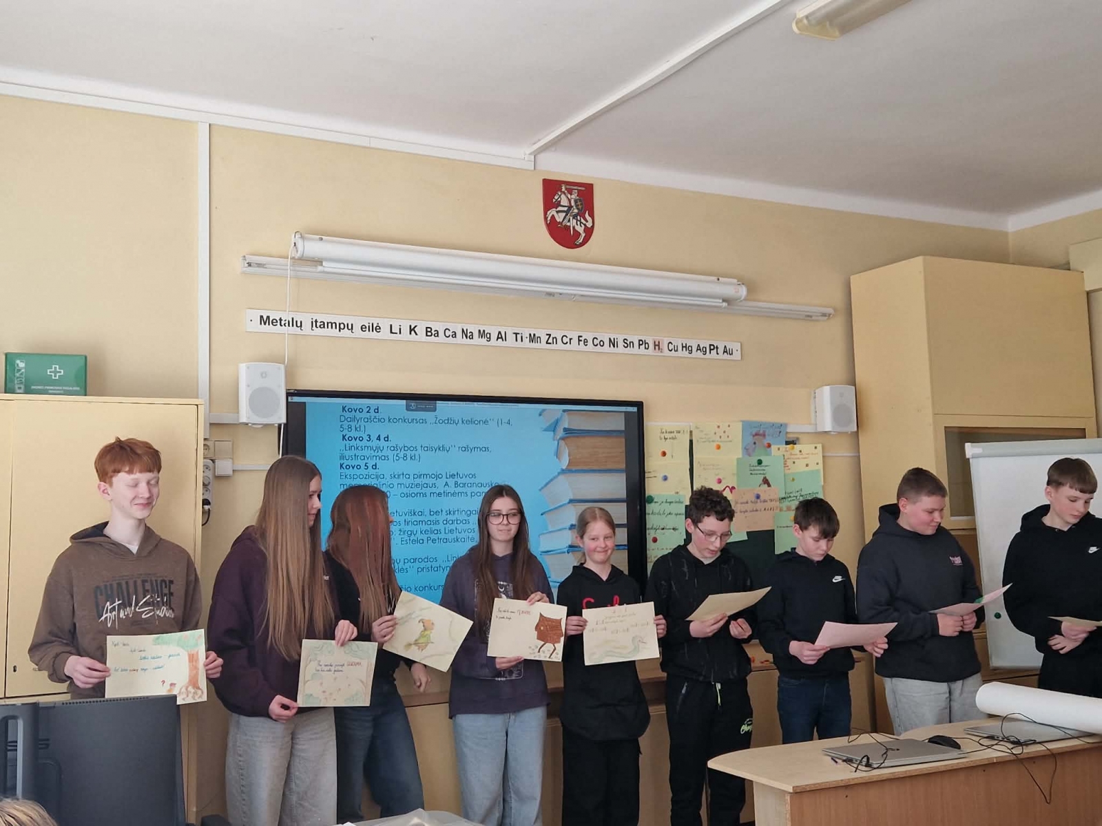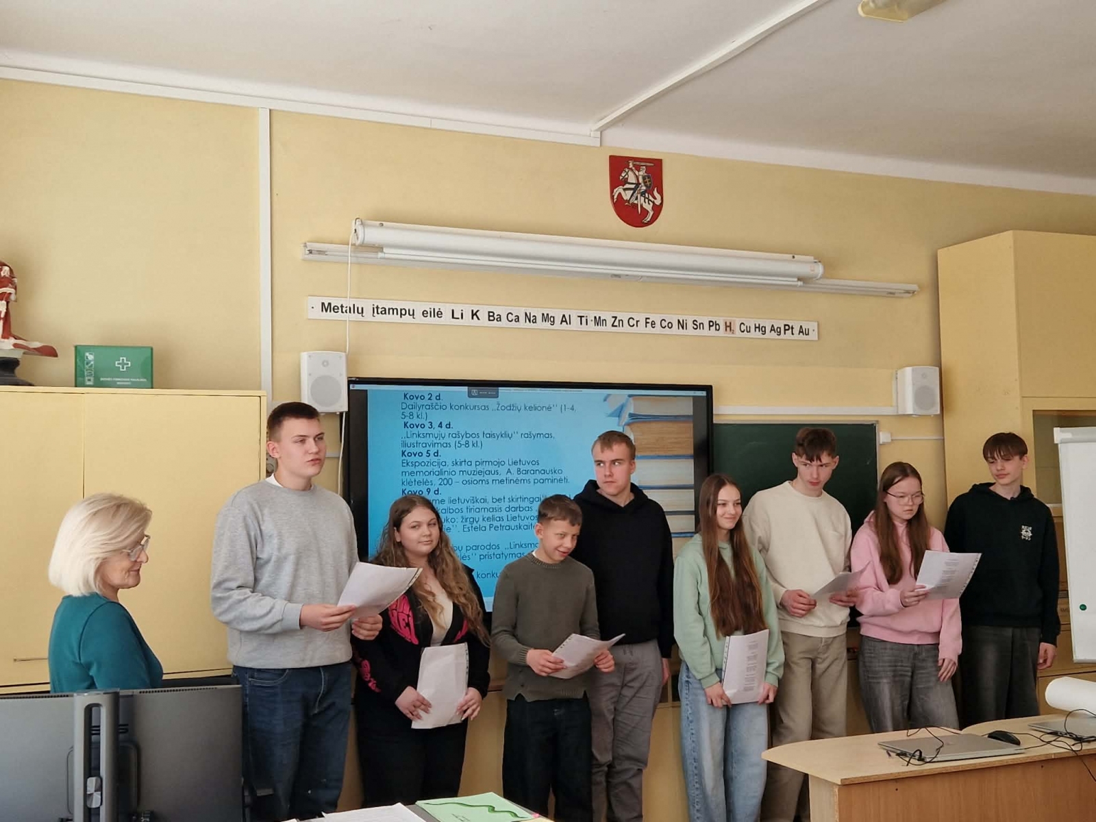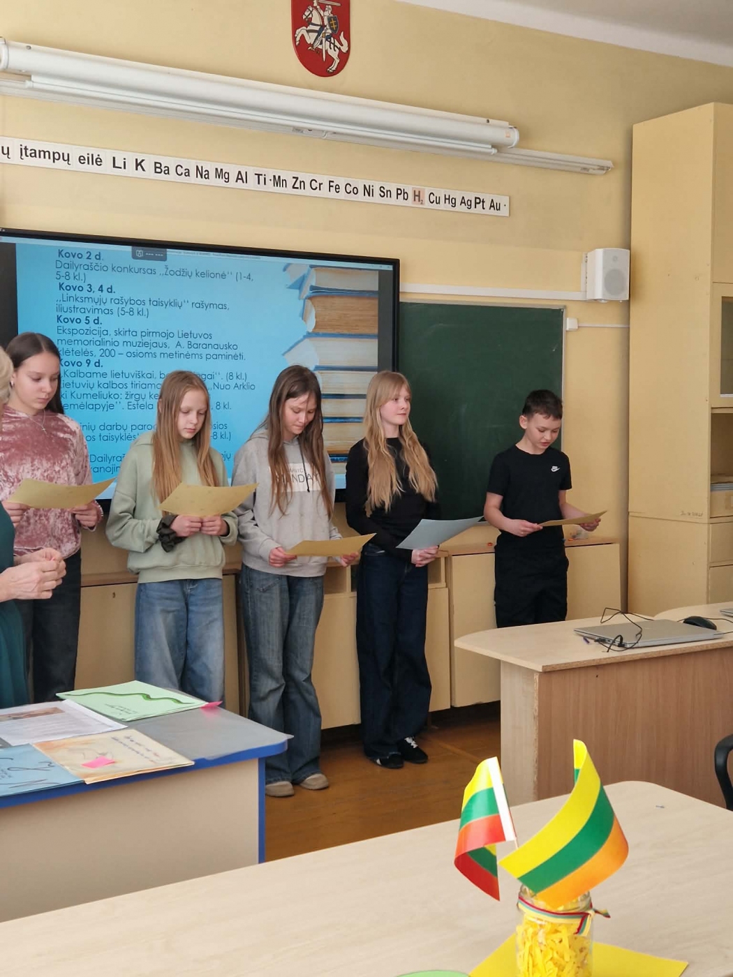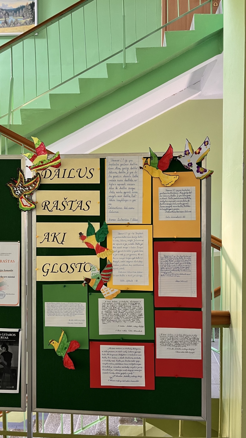 Saulėtą kovo 10-osios popietę visi susibūrė bendrai veiklai: užbaigti Lietuvių kalbos savaitę, prisiminti gimtosios šalies istoriją, pasidžiaugti, kad gyvename laisvoje Lietuvoje. Skambėjo tekstai skirtingomis tarmėmis, 5 komandos pasitikrino žinias apie mūsų šalies istoriją, simbolius ir svarbius įvykius spręsdamos kryžiažodį ir varžydamosi Kahoot žaidime. Po smagių varžytuvių visi rašė sveikinimus bei linkėjimus Lietuvai, juk kiekvienas esame Lietuvos dalis - savo darbais, pagarba ir vienybe galime prisidėti prie jos gražios ateities kūrimo.